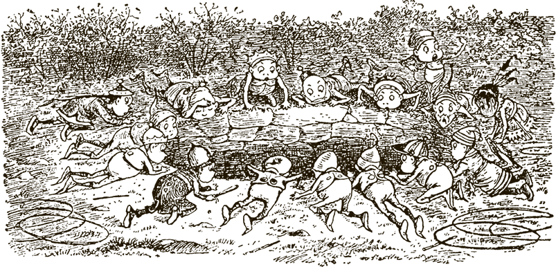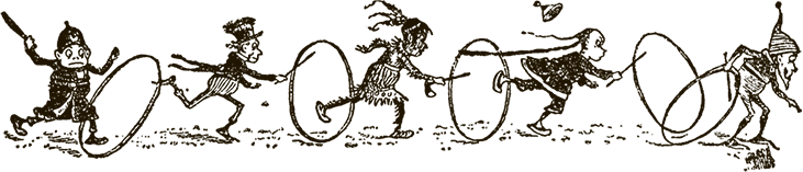 Наконец все обручи были сняты, и с маленькими палочками в руках весёлая толпа помчалась по дороге.