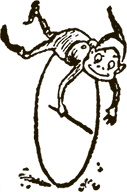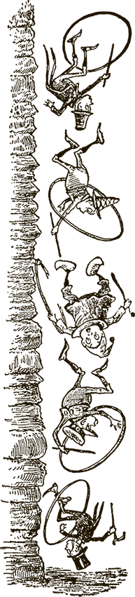 Мы тем временем бежали всё быстрее и быстрее. Всех опередив, Знайка стал показывать удивительные фокусы: разгонял обруч, затем разбегался сам и перелетал через него как птица. Увлечённые его ловкостью, мы мчались вперёд, не разбирая дороги.