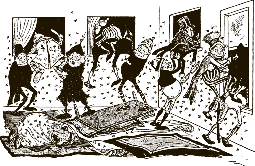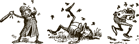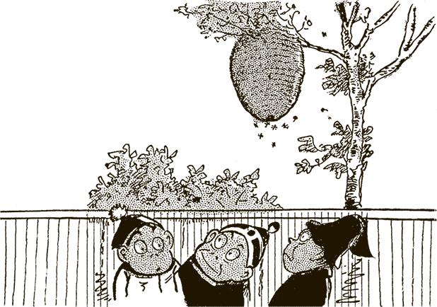 Оказалось, что, пока мы спали, к ящику с пчёлами пробралась кошка и, услышав, что там что-то шевелится и жужжит, бросилась на гнездо, разодрала когтями и выпустила всех пчёл. Тут-то и поднялась суматоха! Насекомые мгновенно разлетелись по комнате и с жужжанием бросились на нас, нещадно жаля. В один миг мы были покусаны с ног до головы. Спросонья, в страхе, метались мы по комнате в поисках выхода, а наши враги как будто издевались. Никогда ещё они не кусались так больно. Не знаю, чем бы всё кончилось, если бы мы не догадались выбраться через окна. Один за другим мы выскочили на улицу, но разъярённые пчёлы упорно преследовали нас. Ещё долго мы от них отбивались, пока наконец не очутились в безопасности. Но в каком ужасном виде мы были!.. У кого распухла щека, у кого губа. У некоторых носы и лбы украсились огромными шишками. От укусов всё тело ныло и горело как в огне.