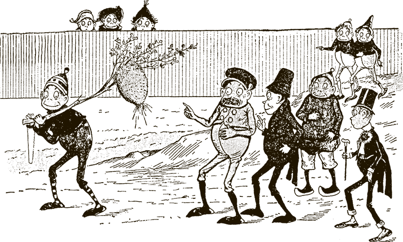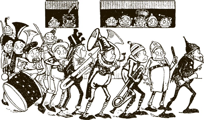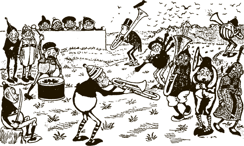 Как бы то ни было, но через час мы уже двинулись к концертной площадке в парке. Впереди всех выступал Дедок Бородач с нотами в руках, за ним шёл Тузилка, держась за руку профессора Трубача, и далее следовали остальные.