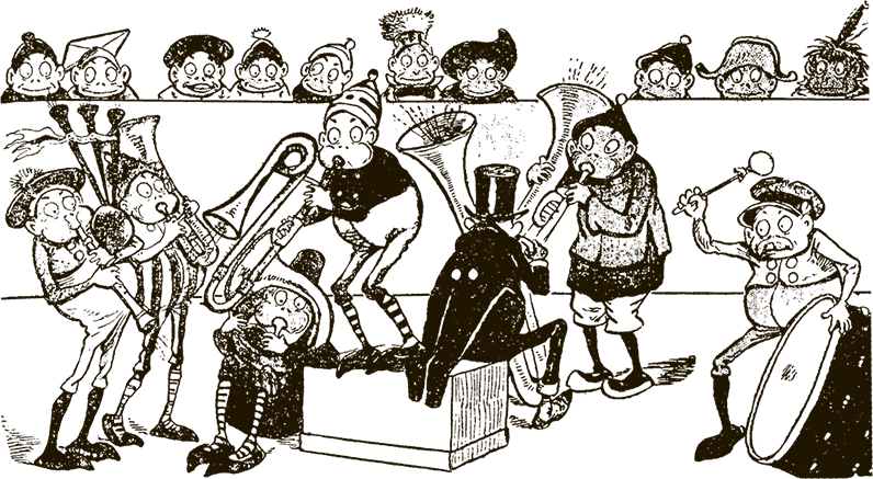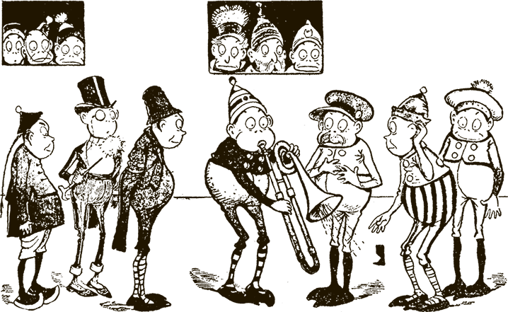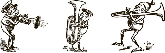 Тогда Трубач предложил мне барабан. Я сначала было согласился, но потом, когда попробовал на нём играть, поспешил отказаться. Дело в том, что при игре на барабане нужно сильно размахивать рукой, а рукава моего фрака довольно узкие, как и диктует мода, и я побоялся, что они лопнут. В конце концов я подобрал себе инструмент – изящную, лёгкую и узкую трубу.