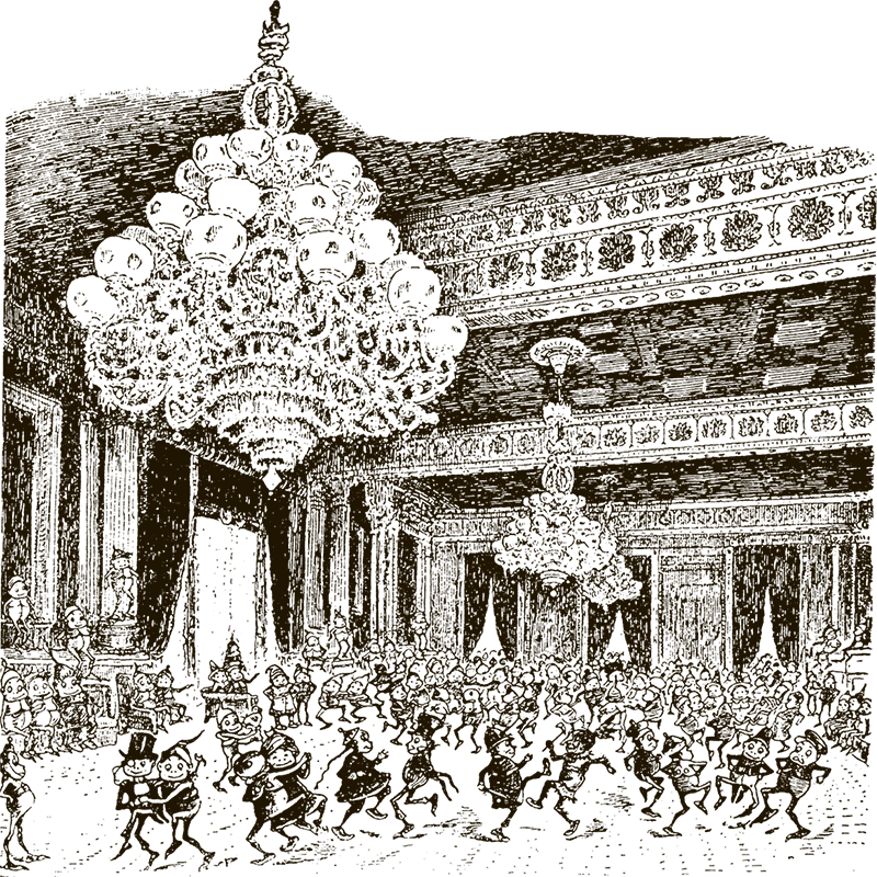 Моему примеру последовали и остальные. По двое, по четверо эльфы носились по залу, едва касаясь ножками паркета, смеялись и пели. Чего только не танцевали! Всё начиная от французской кадрили и кончая пляской американских индейцев и кузнечиков в траве. Музыки не было, но люстры, покачиваясь от шума, позвякивали подвесками, точно оркестр, наигрывающий весёлые мотивы. Тут же летала муха, и в восторге то и дело шлёпаясь о потолок, казалось, распевала: «Ж-ж-ж! Никогда ещё здесь не было так весело…»