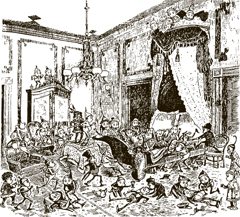 Оказалось, однако, что доктор Тюбик-Мазь был прав: пружины кровати не выдержали, лопнули и в нескольких местах разошлись, так что эльфы повалились на пол, давя друг друга.