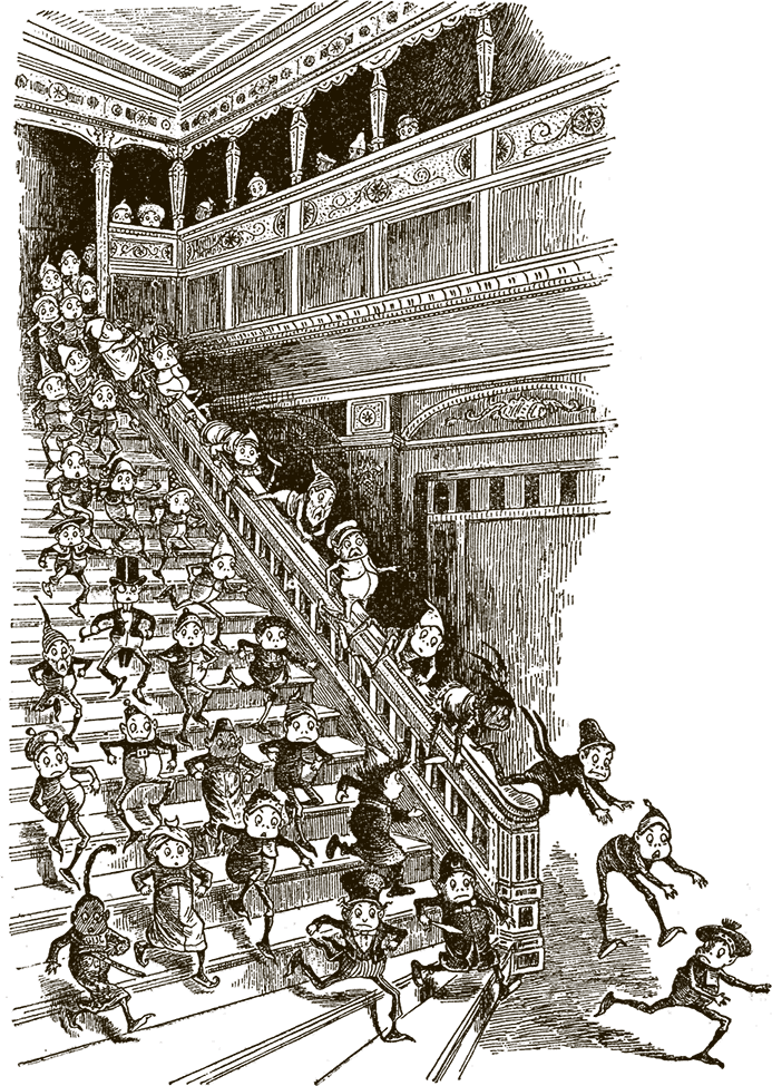 В один миг все очутились на лестнице: одни бежали по ступенькам, другие спускались по перилам.
