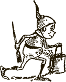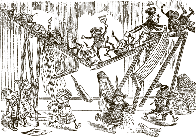 И вот в самый разгар работы случилось непредвиденное: деревянная люлька неожиданно затрещала, очевидно не выдержав тяжести десяти лесных человечков, и проломилась. Вёдра с краской полетели вниз, обливая малюток с ног до головы.