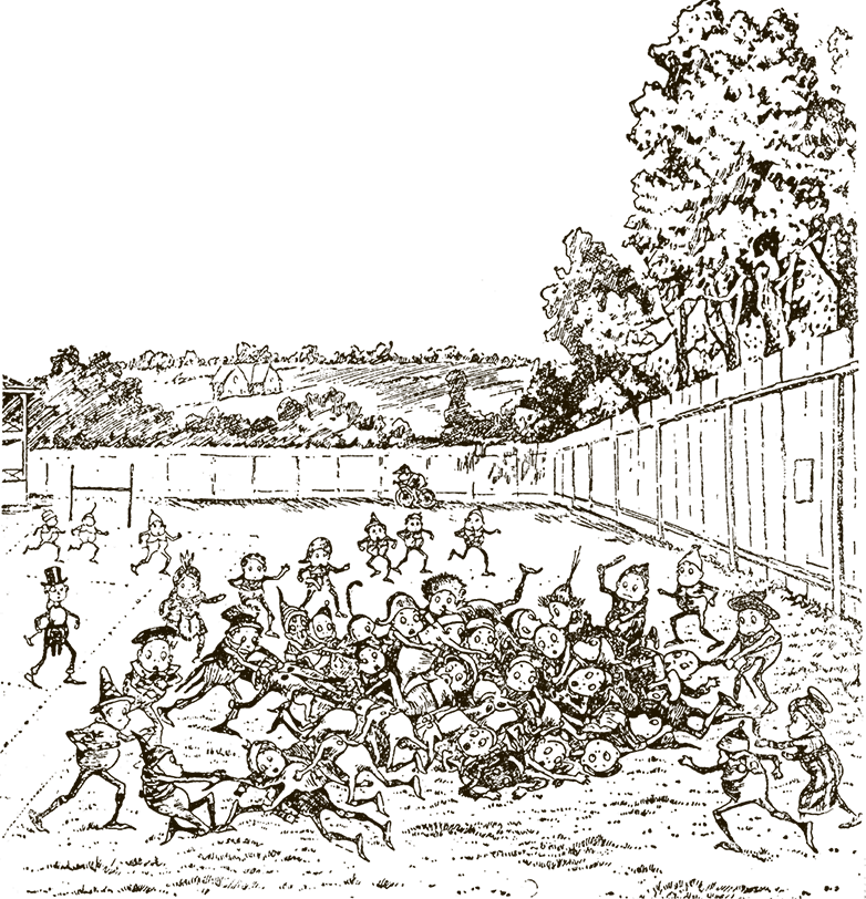Другая команда, с Индейцем во главе, бросилась за мячом, и тут началась страшная свалка. Раздались крики, стоны, визги. Малютки падали один на другого, валялись по земле и старались оттащить нападавших.