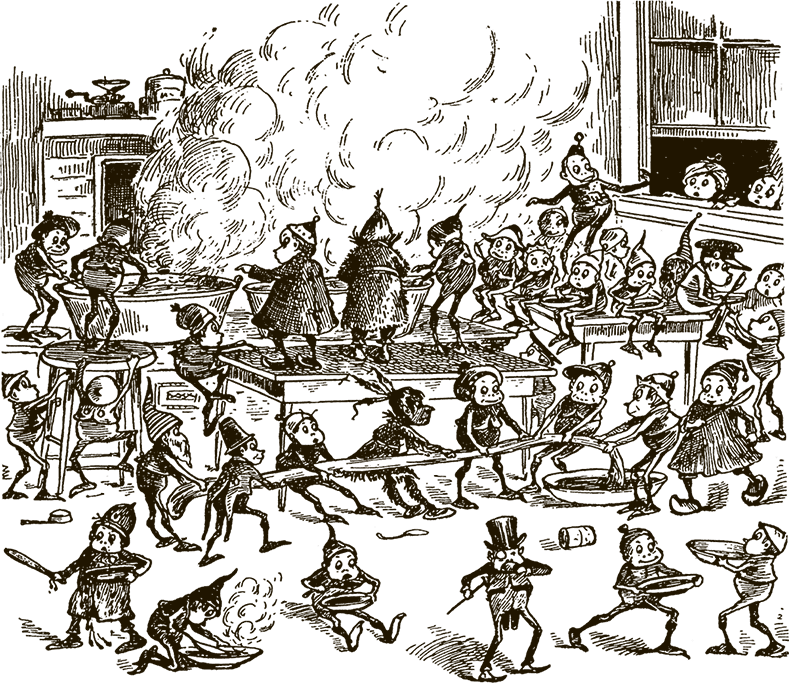 Тем временем в саду действительно появились повара, поварята, лакеи и множество слуг. Увидев разбросанные ножи, вилки и тарелки с остатками котлет, цыплят, пирогов и прочих лакомств, они очень удивились.