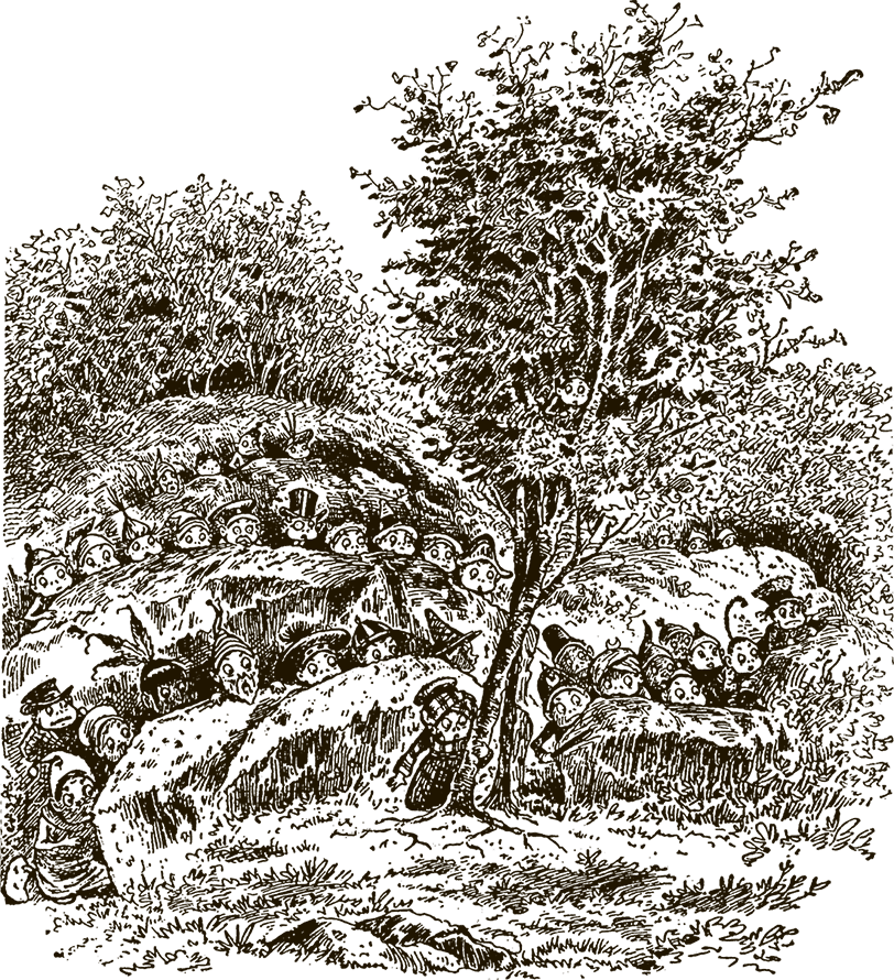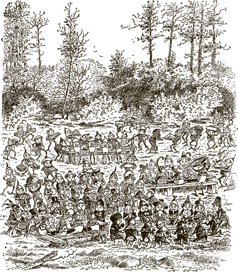 Первыми притомились Треуголка и ещё несколько малюток и вздумали отдохнуть на широченных креслах, куда свободно умещалось несколько лесных человечков. Эльфы же смеха ради принялись туда втискиваться человек по десять, принимая важный вид, и сидели, вытянув ножки, горделиво поглядывая на окружающих, как будто они царственные особы. Потом снова вскакивали и прыгали, покатываясь со смеху.
