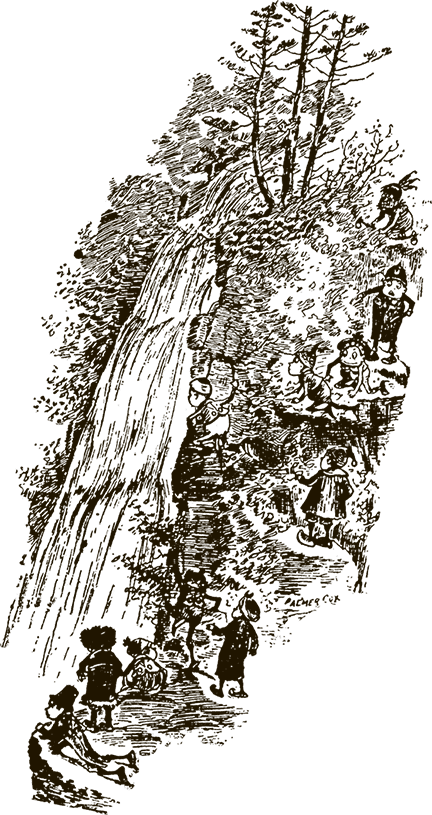 Но вот мы наконец у водопада. Все разбрелись полюбоваться, как вода с шумом и пеной катится вниз: одни уселись на землю, у самого водопада, другие смотрели стоя.