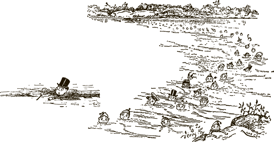 Но этим мои страдания ещё не закончились. Когда мы скатились вниз, для того чтобы добраться до берега, пришлось ещё переплыть через глубокий ручей. Я превосходно плаваю, но на этот раз мне пришлось очень плохо. И не мне одному: все лесные человечки чуть не утонули в ручье.