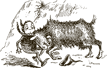 Тогда друзья задумали его связать, и Знайка, схватив верёвку, погнался за козликом, обходя его слева, Микробик – справа. Долго гонялись за ним малютки, наконец сумели накинуть верёвку ему на рога, но и тут животное заупрямилось – и ни с места. Знайка с Микробиком позвали Незнайку, и все втроём схватились за верёвку. Тянут-тянут, но козлик ни с места. Устали человечки, отпустили верёвку, а козлик как бросится на Знайку, как подденет его рогами!