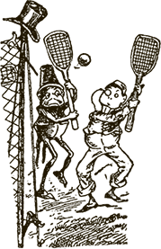 Когда мы играли в лаун-теннис, доктор Тюбик-Мазь так неудачно ударил по мячу, что тот попал мне прямо в лицо и чуть было не разбил мой монокль, а на лбу у меня выросла такая шишка, что все думали, это у меня яблоко на голове выросло…
