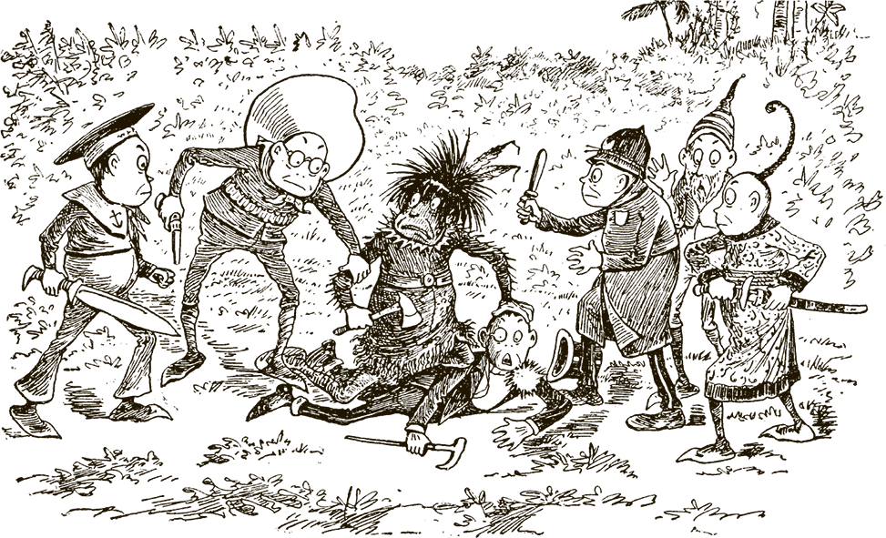 Хорошо, что на крик Индейца сбежались вооружённые саблями, ножами и револьвером охотник Мик, Матросик, Всезнайка, Дедок Бородач и китаец Чи Качи. На их вопрос «Где разбойник?» индеец указал на лежавшего на земле малютку, который от страха потерял голос и только отчаянно моргал глазами.
