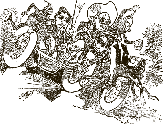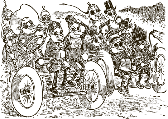Прежде чем объявить начало гонок, все малютки надели большие темные очки, а носы спрятали в особых футлярах. Это было необходимо, потому, что при быстрой езде пыль поднимается столбом, забивается в глаза и нос, а затем попадает в лёгкие.