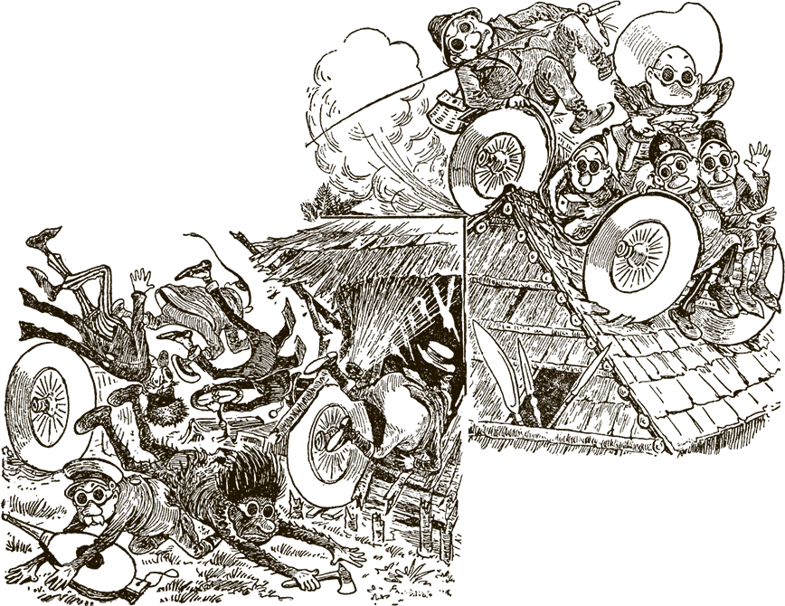 «Тррах!» – и крыша, не выдержав тяжести, проломилась. Горе-гонщики очутились внутри избушки, оглашая окрестности воплями: у кого оказалась сломана рука, а у другого – нога. Доктор Тюбик-Мазь, которому тоже досталось при падении, прихрамывая, едва успевал делать остальным перевязки.