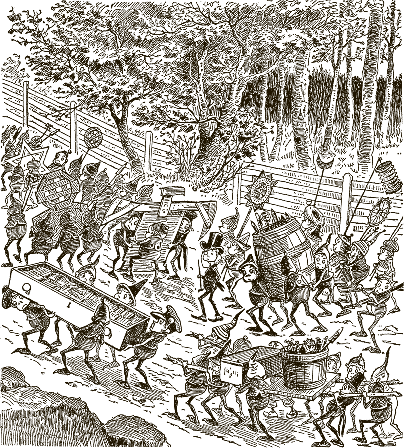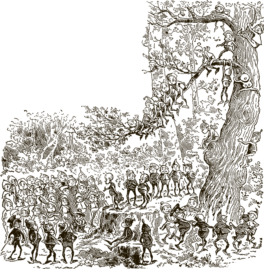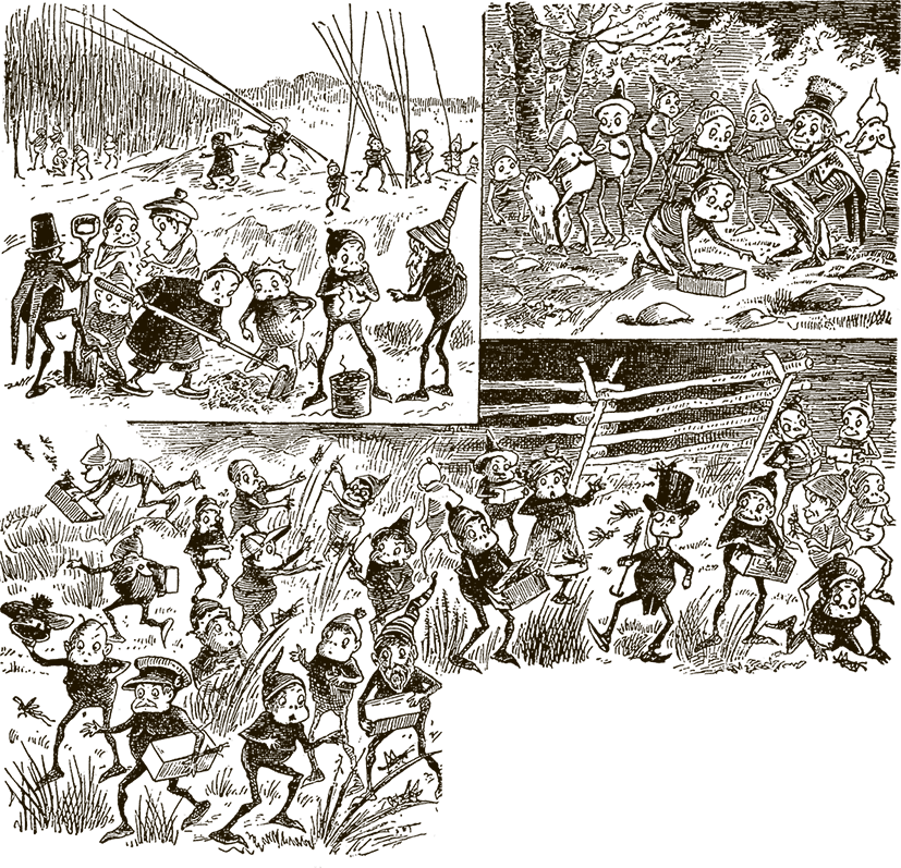 Весь день лесные человечки шмыгали по городу и, пролезая через замочные скважины и щели, с любопытством осматривали жилища – как роскошные дворцы, так и бедные хижины и даже шалаши.