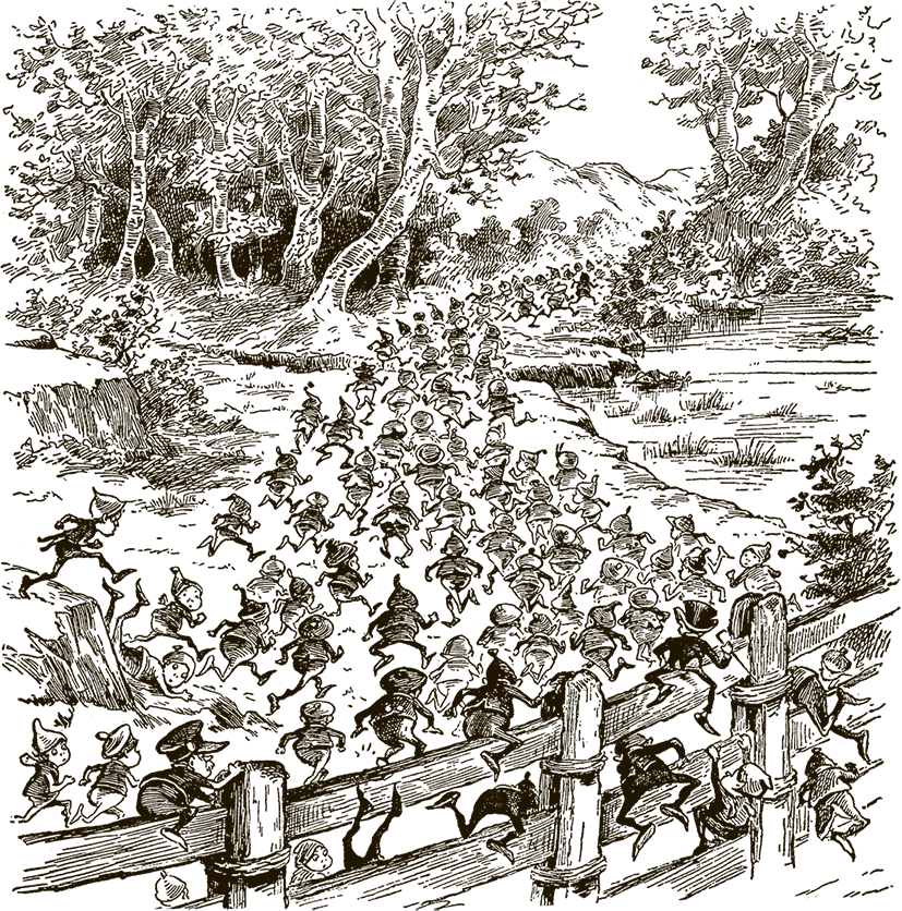 – Ах как это было смешно! – заливался Мурзилка. – Дёрну я одного за косичку, тот обернётся – меня, конечно, не видит и, решив, что это сделал кто-нибудь из прохожих, давай с ним ругаться. А прохожий думает: «Верно этот человек с ума сошел, лучше уйти подобру-поздорову», – и опрометью бросается бежать. Обиженный за ним. Вот умора! А я между тем принимаюсь за другого.