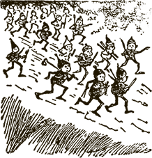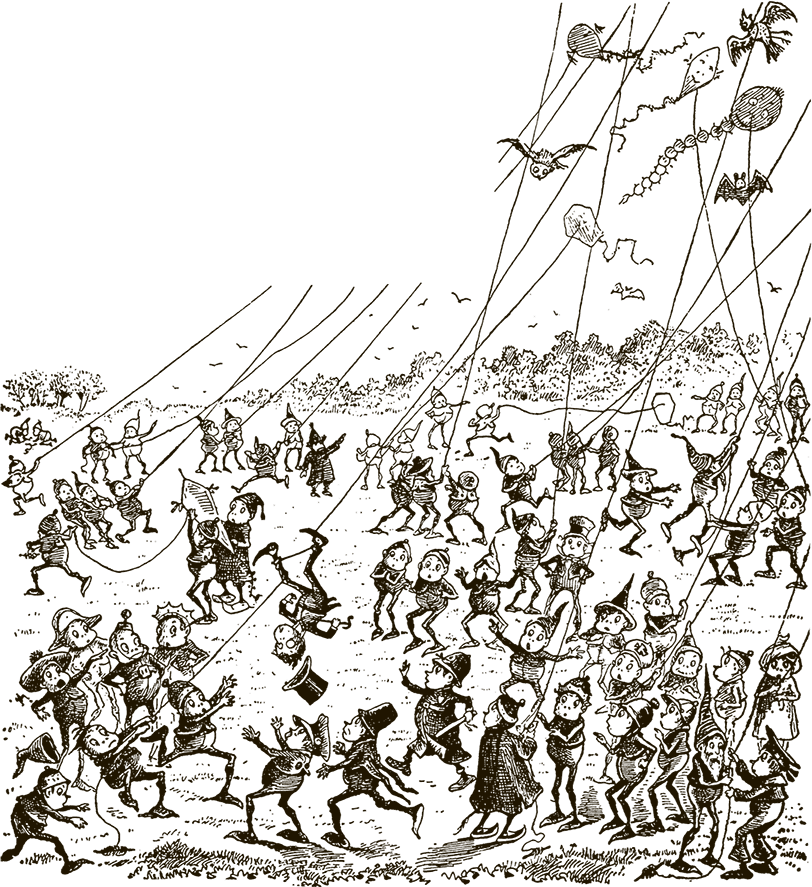 Чуть только солнце окрасило небо на востоке, эльфы выбрались из цветочных постелек и высыпали со своими бумажными змеями на самую большую лесную поляну. Вот раздался сигнал, и десятки змеев взвились под небеса.