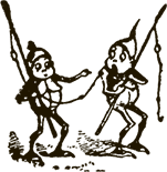 – Друзья, рыбу можно ловить по-другому, я знаю как! – воскликнул доктор по прозвищу Тюбик-Мазь, одетый во фрак с узенькими фалдами, с высоким цилиндром на голове и длинным носом. – Надо только смастерить удочки…