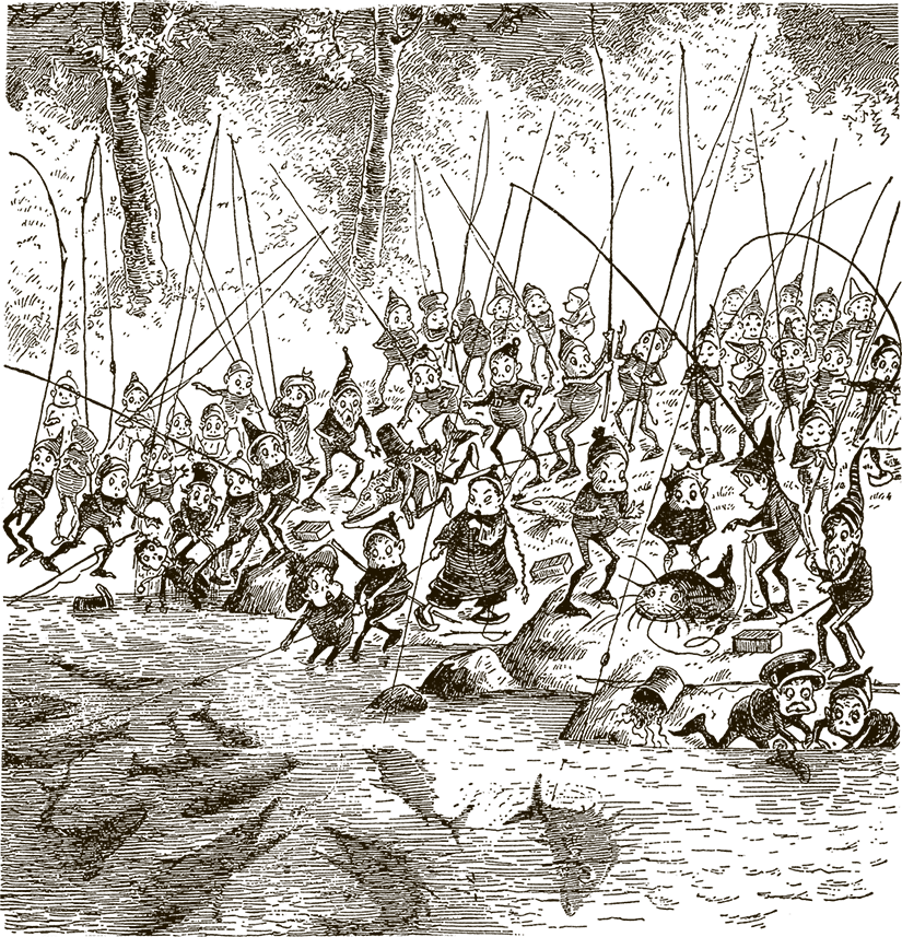 В ту же минуту лесной народ разбежался кто куда: одни кинулись в болото за тростником; другие устремились в город за крючками и леской, а третьи принялись копать червей. Турок притащил из лесу ведёрки, коробочки и лопатки, и компания дружно принялась за дело. Гибкий тростник с шуршанием падал под острыми ударами ножа, коробочки быстро наполнялись кормом для рыб. Вскоре принесли леску и крючки. Эльфы уже собрались было сесть за сборку удочек, как вдруг их внимание привлёк душераздирающий крик.