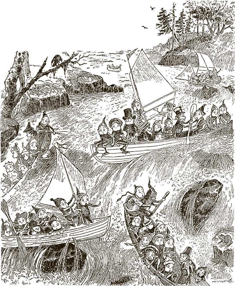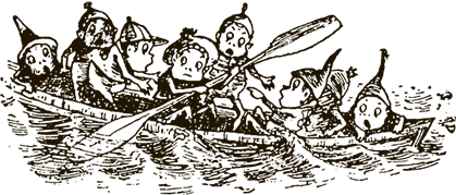 Вскоре показалось массивное строение, в котором, по словам Всезнайки, хранились лодки. Малютки недолго думая проникли через щели в стенах и замочные скважины внутрь, раскрыли волшебной разрыв-травой двери, вытащили несколько лодок и с криками и песнями спустили на воду. Запрятав лодки в густых камышах, крошки как ни в чём не бывало вернулись в лес, чтобы следующей ночью пуститься в далёкий путь.