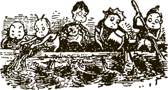 К счастью, море было спокойным, и лёгкие скорлупки-невидимки, чуть подгоняемые ветерком, быстро скользили по волнам. Так проходили день за днём, Жёлтое, Синее и Китайское моря давно уже остались позади. Путешествие шло благополучно, только однажды малютки чуть не погибли, нечаянно налетев на подводные скалы. Лодки дали течь, но благодаря ловкости и проворству своего вожака Заячьей Губы эльфы избежали опасности. Пристав к берегу и подлатав лодки, лесные человечки на следующий же день снова пустились в путь.