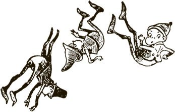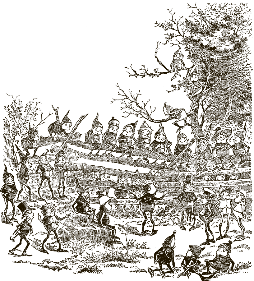 Эльфы тотчас позабыли о змеях и бросились спасать несчастного, которого угораздило запутаться в верёвках и перевернуться вверх ногами. Пока подоспела помощь, Мурзилка, к всеобщему ужасу, поднялся на значительную высоту; лишь с большим трудом удалось его освободить.