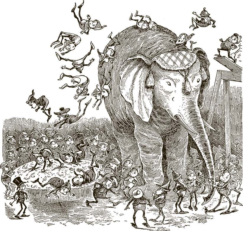 Эльфы поначалу оробели, но видя, что слон стоит спокойно, слегка покачивая длинным хоботом, успокоились и, вскарабкавшись к нему на спину, принялись скакать и кувыркаться. Даже доктор Тюбик-Мазь и тот не отставал от собратьев, так что маленькие человечки устроили на спине великана настоящий цирк. Всем было очень весело, и только трусливый Мурзилка стоял в стороне.