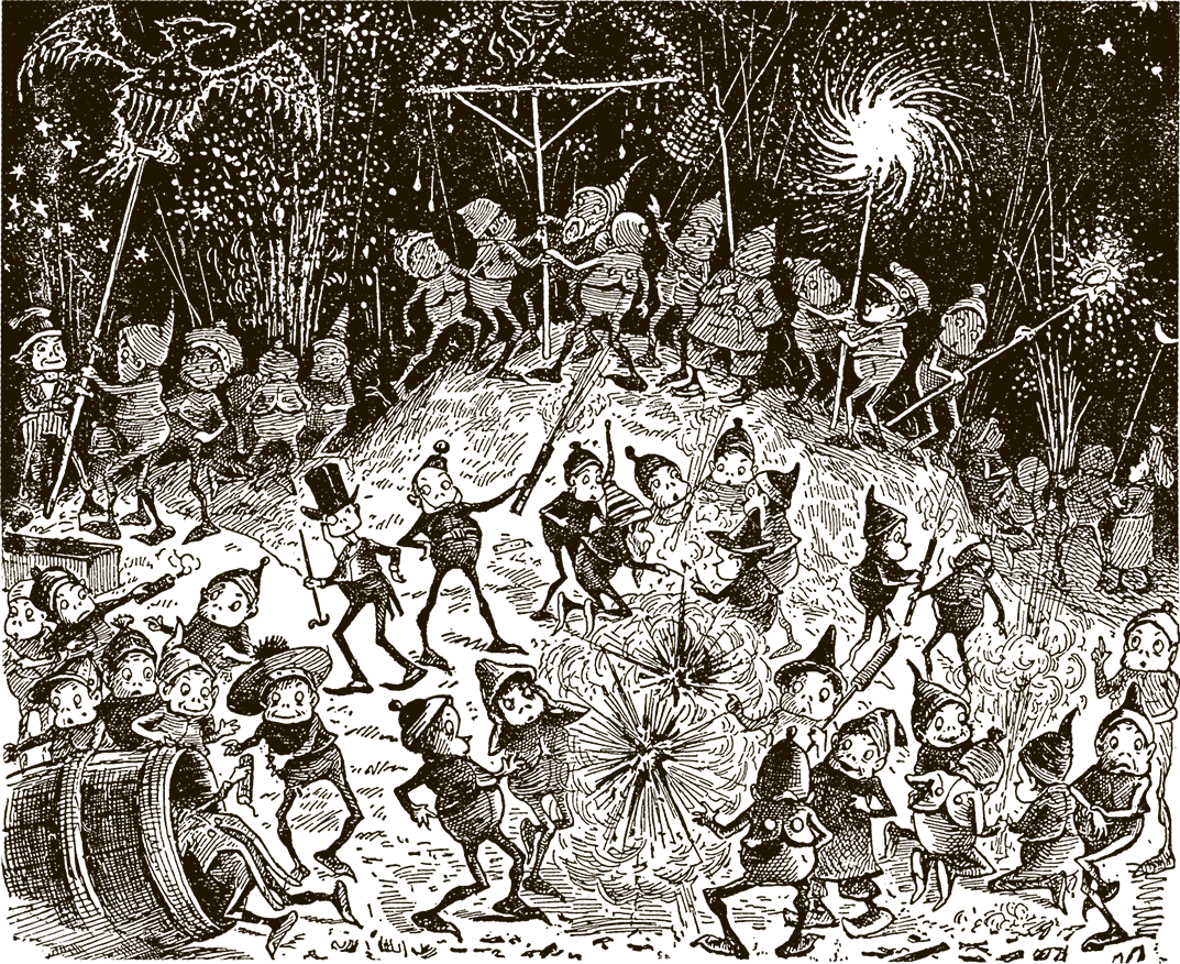Рассыпавшись по ковру, малютки из разговоров узнали, что празднество и фейерверк устроены в честь раджи. Лесные человечки никогда раньше не видели ничего подобного, но им так понравился фейерверк, что они решили устроить такой же по случаю дня рождения Всезнайки.