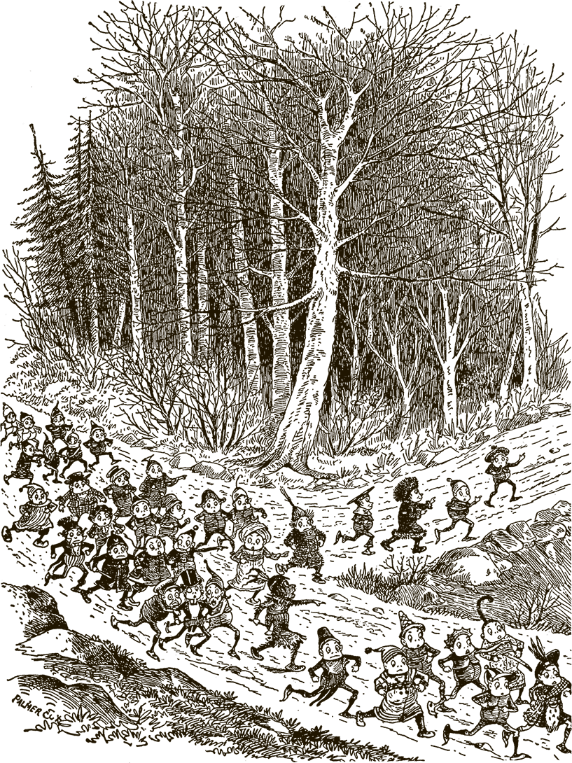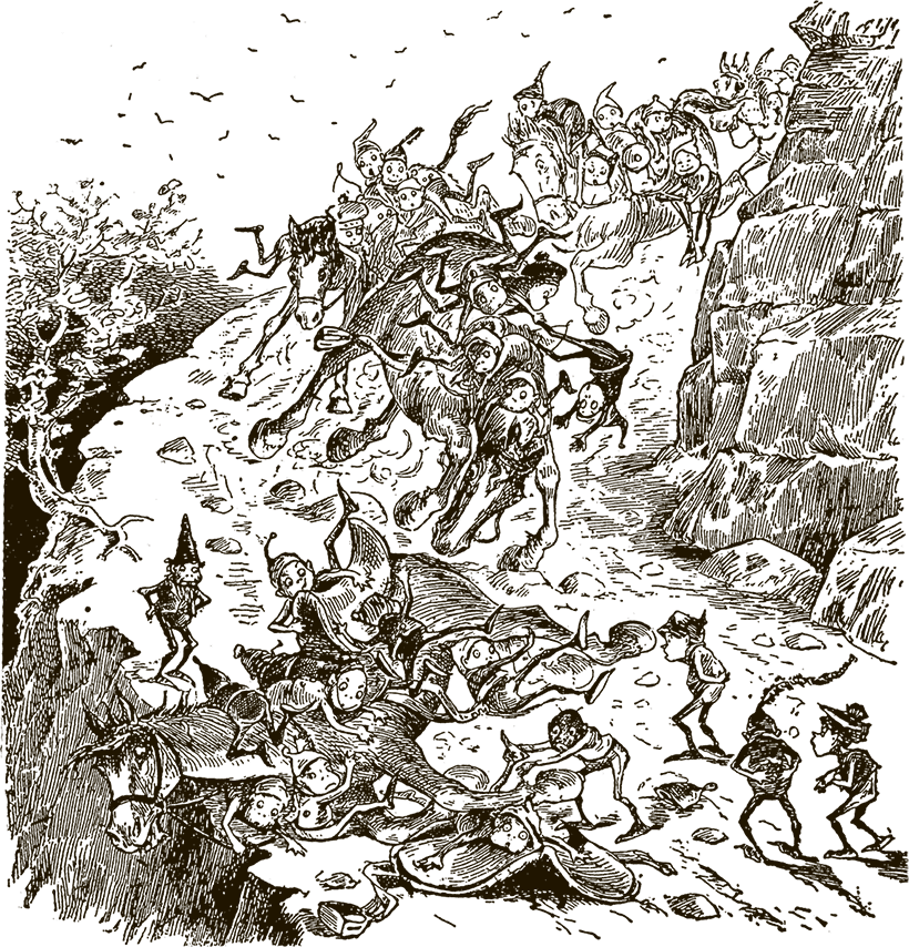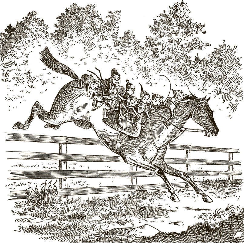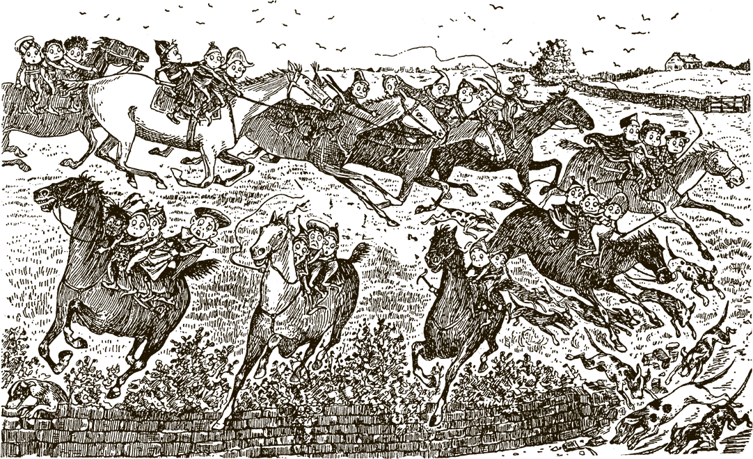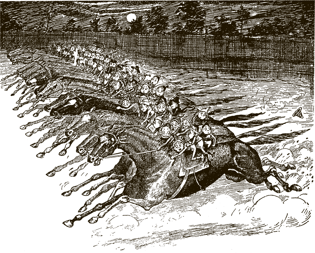 Не прошло и минуты, как малютки уже сидели на конях и мчались во всю прыть, причём на каждом поместилось по несколько крошечных седоков.