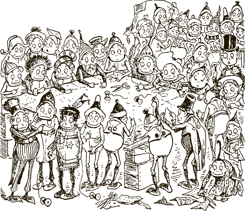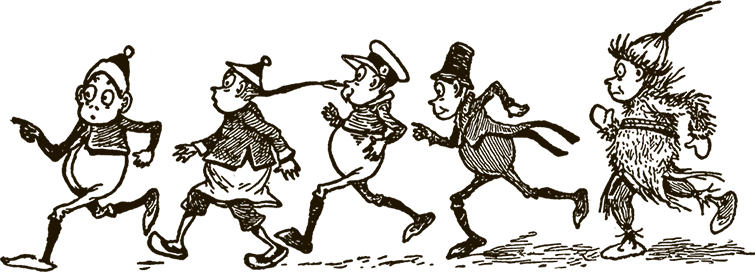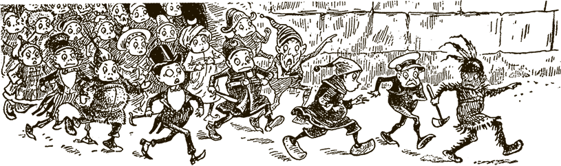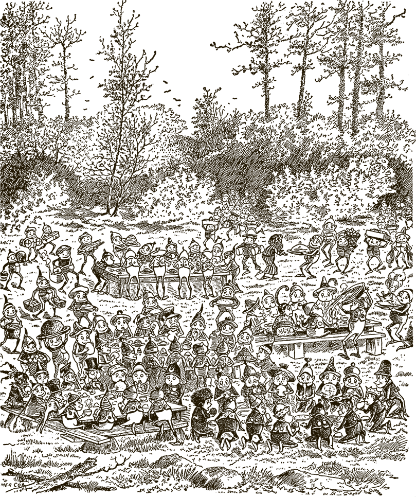 Бежали что было сил. Бедный Мурзилка по обыкновению не поспевал за другими, и его пришлось взять под руки и чуть ли не тащить всю дорогу, так же как и Чи Качи. Трудновато было и некоторым другим малюткам, но в конце концов все благополучно добрались до накрытых столов, о которых говорил Дедок Бородач.