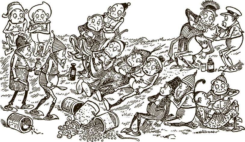 Чужая еда не пошла впрок маленьким человечкам – после обеда многие стали жаловаться на боль в желудке – очевидно, объелись. Доктор Тюбик-Мазь достал из своей аптечки нужные лекарства, раздал заболевшим, но вскоре и сам почувствовал себя дурно. Пришлось обязанности доктора взять на себя другим эльфам – к счастью, расхворались не все. В конце концов через некоторое время всех удалось поставить на ноги и всё закончилось благополучно.