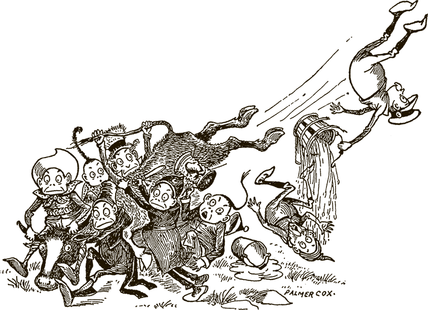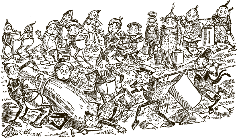 Мурзилка шёл впереди, но загляделся на пролетавшую птицу, споткнулся и упал, толкнув при этом эльфов, что несли за ним ведро. Молоко разлилось, окатив Мурзилку с ног до головы. Не успел он подняться с земли, как Заячья Губа и Тюбик-Мазь наткнулись на лежавший посреди дороги камень и тоже облили Мурзилку.