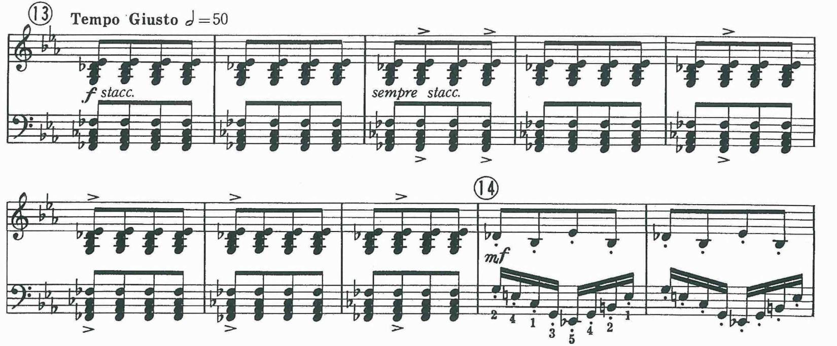 Пример 1 – И.Ф. Стравинский, «Весна священная», переложение для одного фортепиано С. Рафлинга (S. Raphling), часть первая, «Пляска щеголих» (такты 1–5)