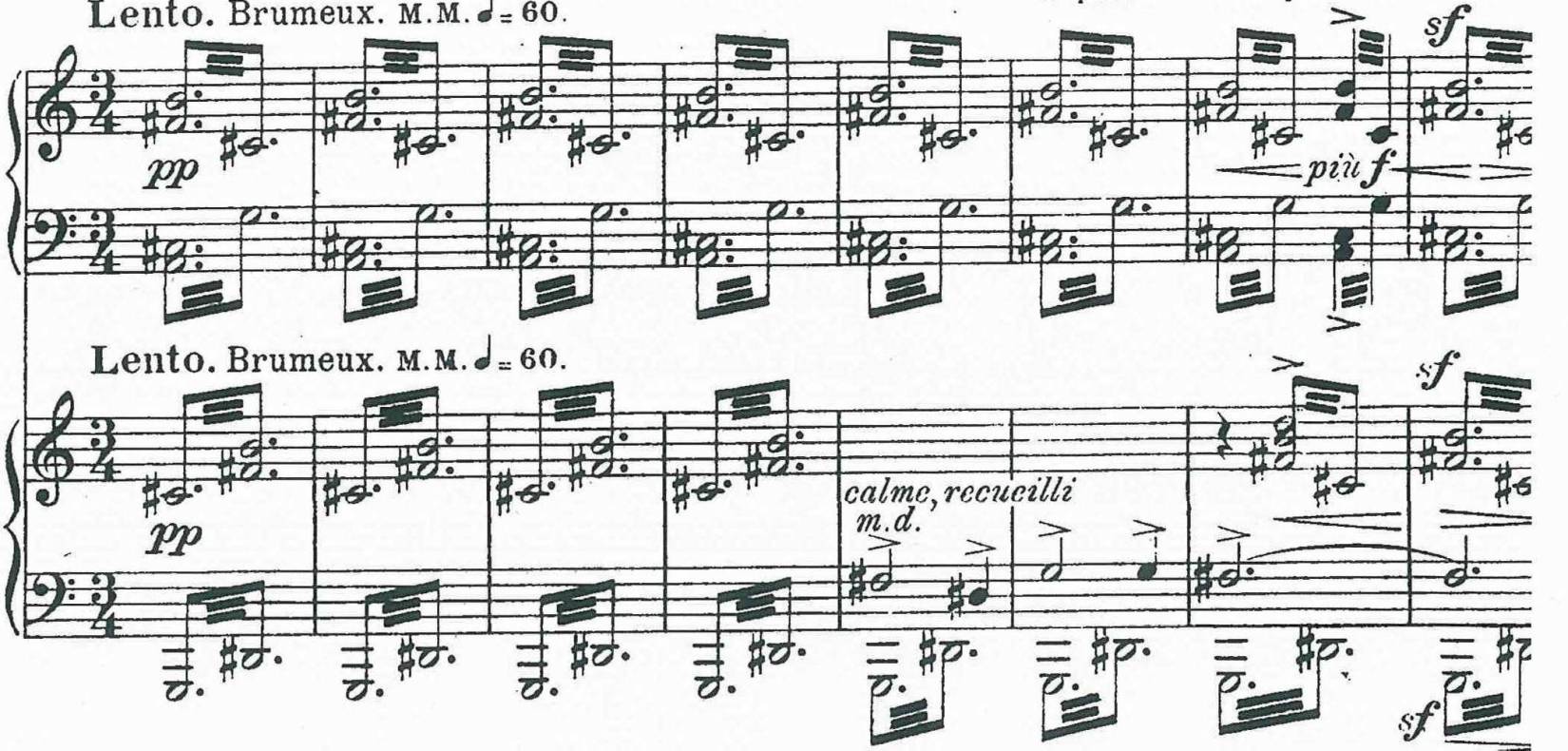 Пример 2 – А.Н. Скрябин, «Прометей» ор. 60, переложение для двух фортепиано Л.Л. Сабанеева (такты 1–8)