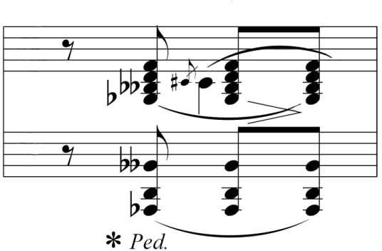 Пример 3 а – А.Н. Скрябин, Седьмая соната ор. 64, главная партия, тройной повтор аккордов в сфере таинственного (такт 4)