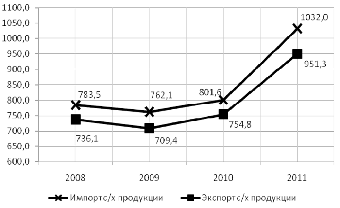 Рисунок 1.1.1 – Динамика мирового экспорта и импорта сельскохозяйственной продукции в 2008–2011 гг., млрд долл.