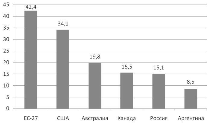 Мировая торговля пшеницей в 2011 г. выросла на 3 % по сравнению с 2010 г., достигнув 150 млн т. Общему росту объемов торговли, несмотря на сокращение потребления пшеницы в странах ЕС, способствовали высокие урожаи пшеницы в ведущих странах-экспортерах. Список ведущих стран-экспортеров пшеницы достаточно стабилен, однако их очерёдность в нём в последние годы испытывает частые изменения. Лидерами продолжают оставаться страны ЕС (в совокупности) и США, на третье место впервые за последние 8 лет вышла Австралия (рис. 1.1.2).