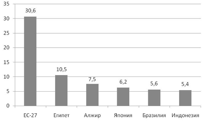 Среди импортеров пшеницы в мире также лидируют страны ЕС–27 (в совокупности). Второе и третье места занимают североафриканские государства – Египет и Алжир. Значительные объемы пшеницы импортируют Япония, Бразилия и Индонезия (рис. 1.1.3). Алжир в 2011 г. по сравнению с 2010 г. в наибольшей степени увеличил импорт пшеницы – на 2,5 млн т. Страны ЕС, напротив, сократили импорт пшеницы на 3 млн т, также снизили объемы импорта США, Бразилия и Египет.