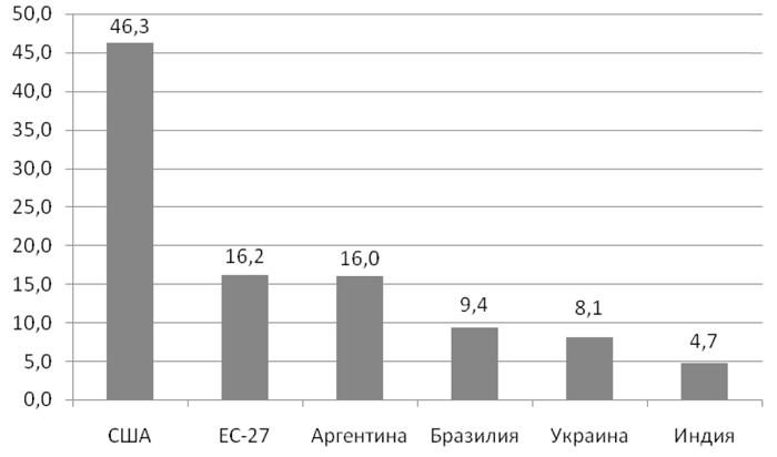 Тем не менее США значительно опережают все другие страны мира по объему экспорта кукурузы. По итогам 2011 г. объем экспорта данной культуры из США составил более 46 млн т (рис. 1.1.4). Аргентина по объему экспорта практически «настигла» страны ЕС, а наибольший рост физического объема экспорта кукурузы продемонстрировала Украина (+3,5 млн т).