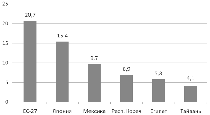 Ведущим мировым импортером кукурузы (после стран ЕС в их совокупности) является Япония, которая, однако, снизила объем импорта в 2011 г. по сравнению с 2010 г. (на 1,5 млн т). Крупными импортерами кукурузы также традиционно остались Мексика, Республика Корея, Египет и Тайвань (рис. 1.1.5). Большинство импортеров снизили объемы закупок.