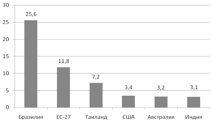 Рисунок 1.1.6 – Основные страны-экспортеры сахара в 2011 г., млн т