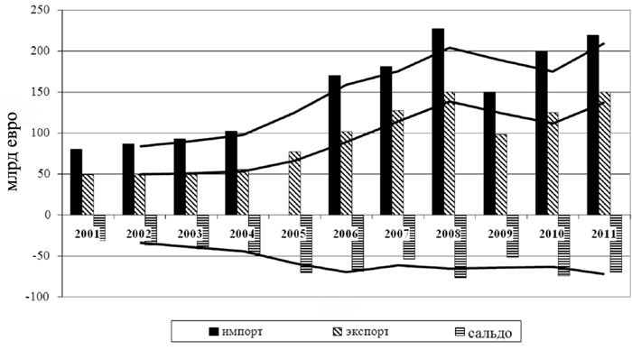 Рисунок 1.1.8 – Межрегиональная торговля стран ЕС и стран СНГ в 2001–2011 гг., млрд евро