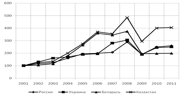 В период 2001–2011 гг. (за исключением «кризисных» 2008–2009 гг.) прирост импорта стран ЕС из стран СНГ в среднем составлял 10,1 % ежегодно. Такой высокий процент роста можно объяснить, главным образом, ростом импорта из России, а также увеличением импорта из Казахстана, Азербайджана и Украины.