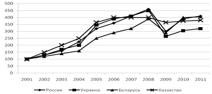 За тот же период 2001–2011 гг. ежегодный средний прирост экспорта стран ЕС в страны СНГ составлял 13,9 %. Данный прирост формировался, в основном, в результате роста экспорта в Россию, Украину, Беларусь и Казахстан (рис. 1.1.10).