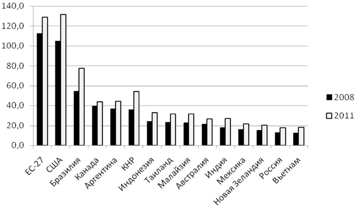 Список крупнейших мировых экспортеров сельскохозяйственной продукции в 2008–2011 гг. не претерпел изменений, это так же страны ЕС, США, Бразилия, Канада, Аргентина и Китай. Все эти страны увеличили объем экспорта продовольствия на мировой рынок в течение данных 4 лет: от 10,7 % (Канада) до 51,0 % (Китай). Однако «распределение мест» в первой пятерке ведущих экспортеров существенно изменилось. Так, в 2011 г. лидером по объему экспорта сельскохозяйственной продукции стали США, хоть и незначительно (на 1,4 млрд долл.), но все-таки опередив страны ЕС. 27 государств ЕС оказались на втором месте (128,9 млрд долл., или рост на 14,5 % по сравнению с 2008 г.) (рис. 1.2.1).