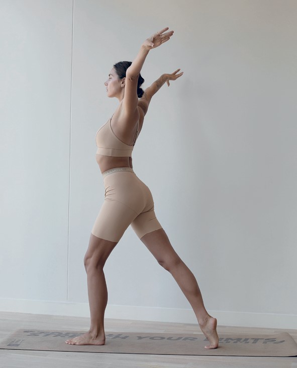 • Руки можно поднять вверх или поставить на талию. Ровное дыхание, плечи тянем вниз, раскрываем грудную клетку, смотрим вперед.