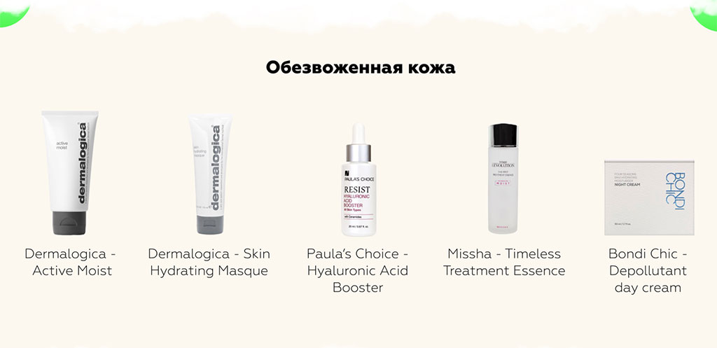 Поэтому нужно насытить кожу водой! Как? Влагоудерживающими компонентами! Глицерином, гиалуроновой кислотой, мочевиной. Запереть эти компоненты нужно при помощи керамидов, линолевой кислоты, Натурального Увлажняющего Фактора, наносить кремы с силиконами и маслами поверх этого состава, запирая увлажнители изнутри! Если ваша кожа обезвожена, выбирайте гелевые кремы, эссенции, тонеры в качестве увлажнителей.
