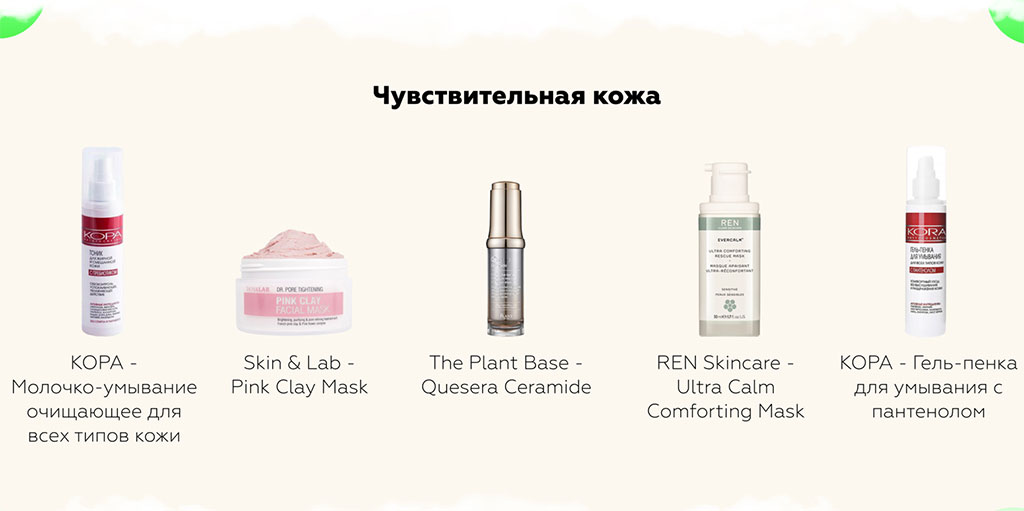 Очень часто симптом чувствительной кожи остается с нами на всю жизнь. Но в большинстве случаев это все же приобретенный симптом, который указывает на раздраженность кожи. Поэтому в подходе к уходу за чувствительной кожей нужно искать такие же компоненты, как и за обезвоженной, направленные на восстановление защитного барьера. Помимо сквалана, минерального масла, силиконов, глицерина, керамидов, НУФ, чувствительной коже отлично подойдет ниацинамид и никотиновая кислота – они помогут коже быстрее восстановиться и обновиться.
