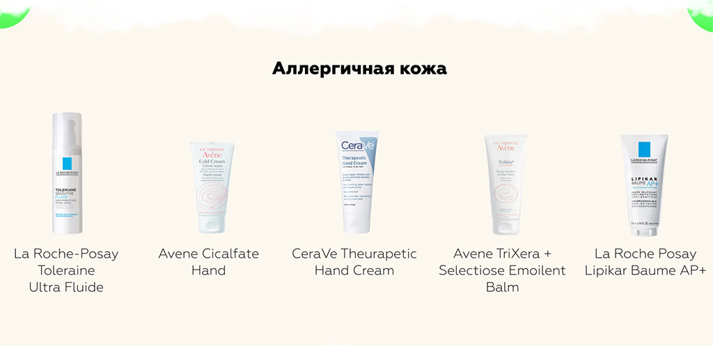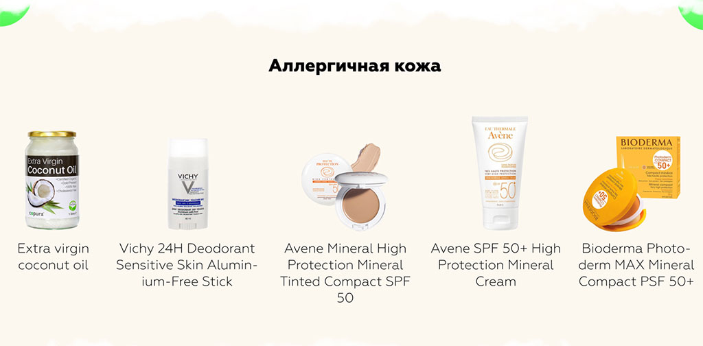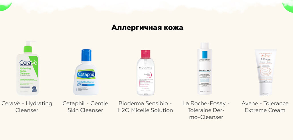 Аллергичная кожа понятна сразу всем ее обладателям. Она остро реагирует на продукты питания или уход, оставляя зуд, сыпь, контактный дерматит, и требует особенного подхода и использования только аптечных марок без спирта, отдушек, эфирных масел, кислот, пилингов. Аллергия может быть временным явлением. Часто бывает, что кожа остро реагирует на новый и незнакомый компонент в косметике, и появляются белая или красная сыпь, зуд, раздражение.